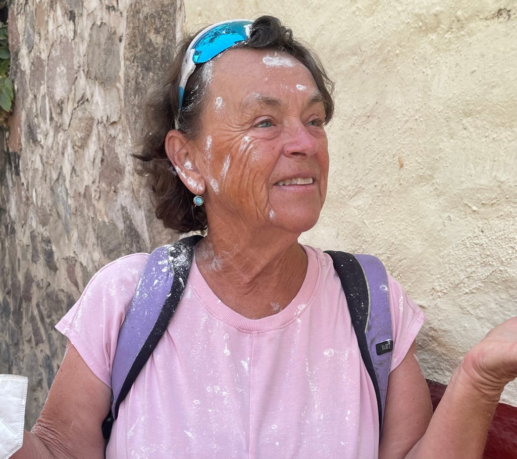 1. Hahaha Bonnie. There are definitely lots of birds here. But that is flour being thrown at a parade. I was saying thank you to the horse and rider letting me pass to the other side of the road. What you don’t see is how much more flour was on me a few minutes later. Good fun!