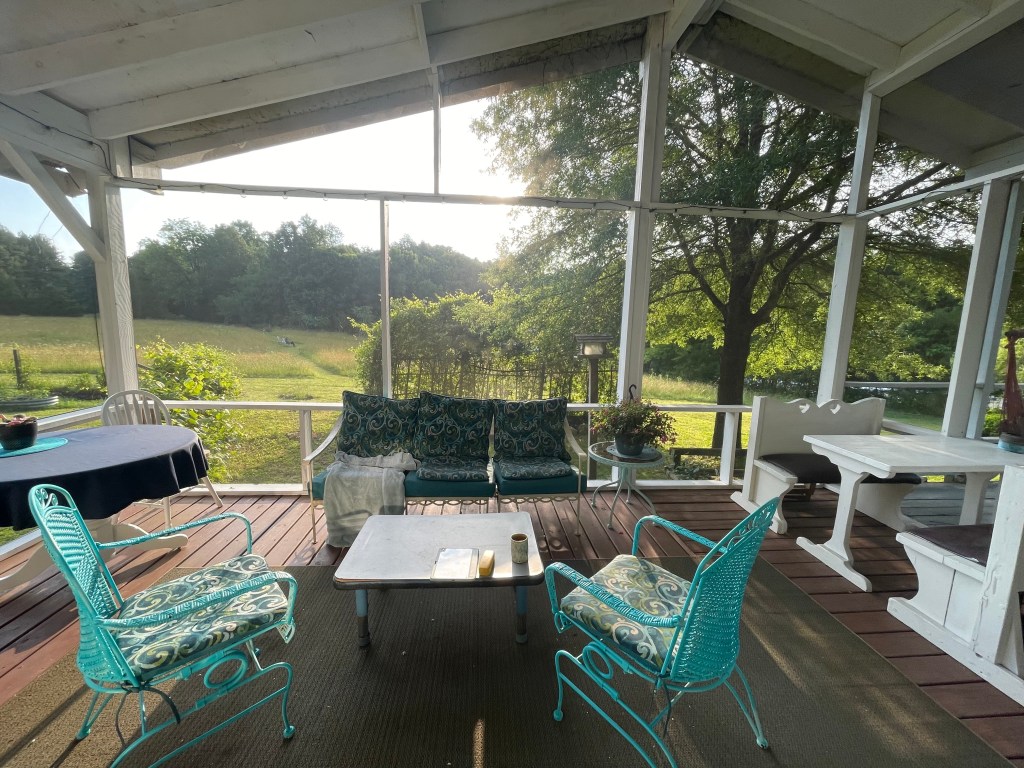 As we prepare for a month in the mountains at Sadie’s Place I begin by sitting. And while I am enjoying the many virtues of this sitting place on our screened porch at Blue Heron Farm, I imagine myself in other sitting places. The glider on the front porch at Sadie’s (mornings). The rocker on the terrace, facing west (evenings). And the newest place, by the stream at Little Guy Landing.