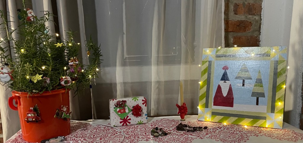 What a wonderful morning! My little Christmas corner is cheerful…a rosemary tree with fairy lights and dangly earrings for decoration. Most of you who know me will be surprised to learn I have dozens of pairs of earrings. Most of them purchased here in Ajijic while walking along the streets and malecon. This is a source of income. An easy way to contribute to the very local economy. And now, a great way to decorate this little tree. Corelli’s Concerto de Noel is playing and there’s no need to hurry for anything. Hot coffee. And plenty of space for morning time with Steve. I love this way of starting the day.