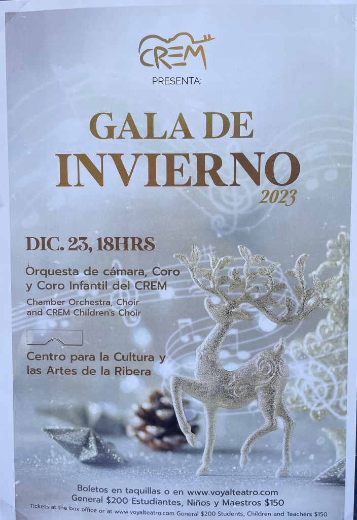 Last night Pam and I went to a Christmas concert. It was a small theatre with nothing but good seats. A very merry, well-designed set complete with stockings hung by the chimney with care. There are LOTS of expats around here with big talent and tons of theatre experience. The primary cast of 6, mostly over the age of 70 expats were delightful and made complete by the addition of two Mexican singers (who sang in Spanish). A young man (maybe 25) sang with great heart and bravado and  a young girl (maybe 14) with showstopper qualities and the sparkling eyes of innocence and joy. I was blown away!!!!